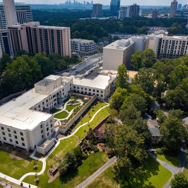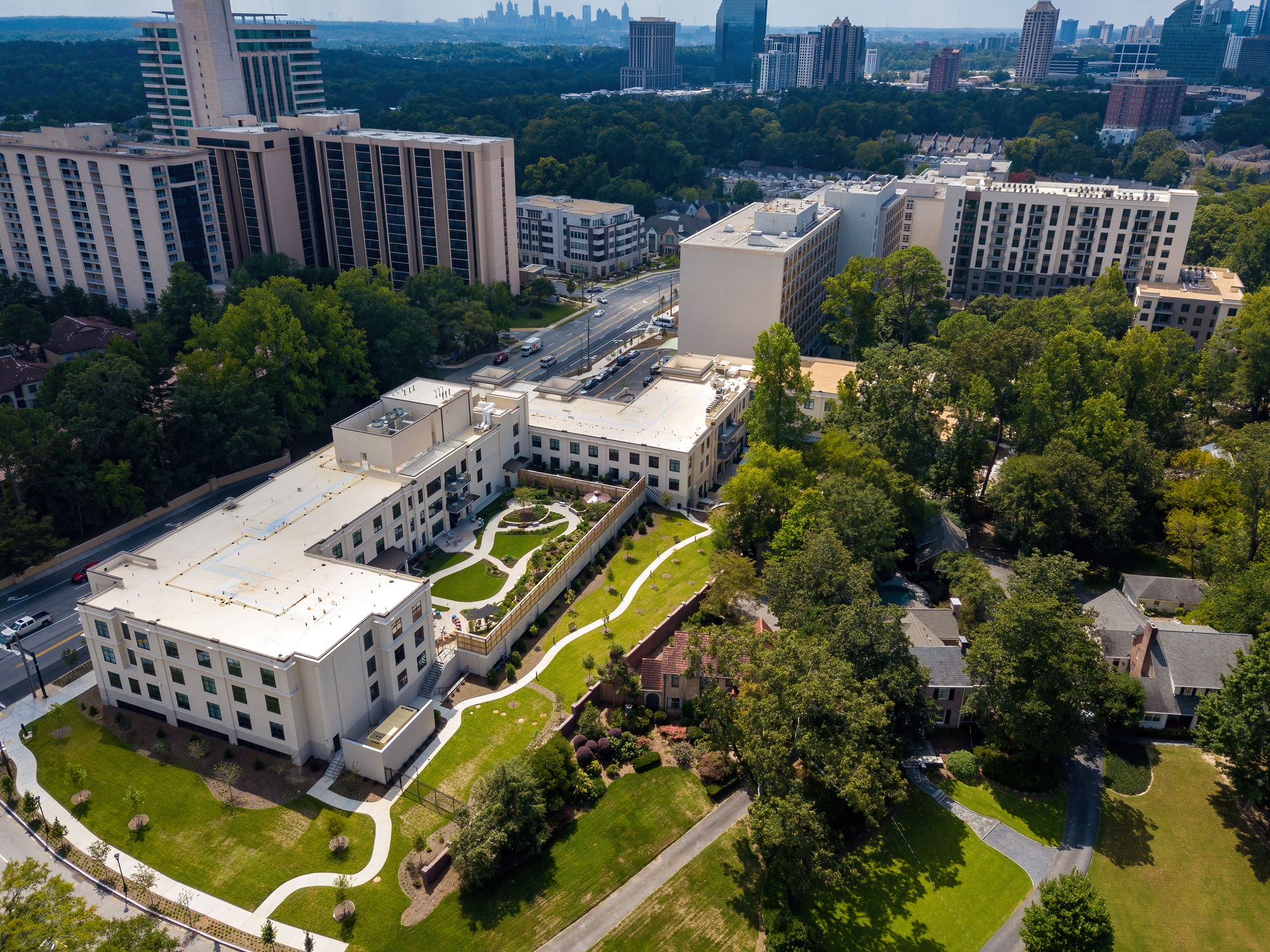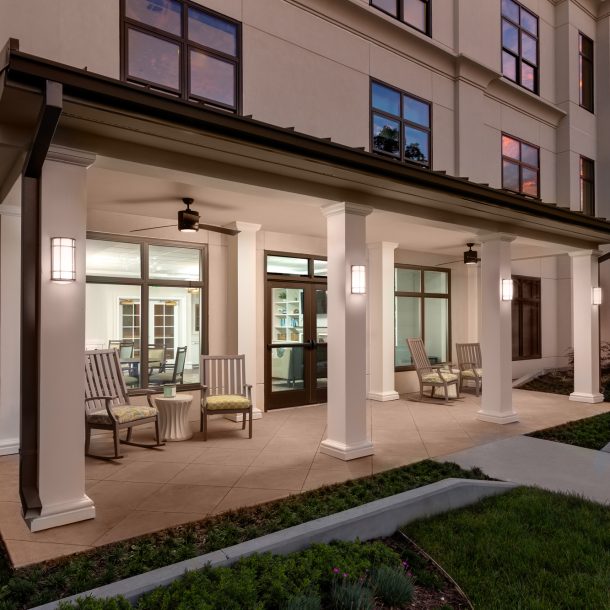 The Healthcare building is all new construction on newly acquired land on the north end of the site. There will be three levels over parking (100 spaces) above a basement consisting of 42 Assisted Care units; 40 Skilled Nursing units; 21 Memory Care units and all of the common/support spaces including a structured amenity courtyard. The first floor will also contain 7 Independent Living units with terraces overlooking gardens.