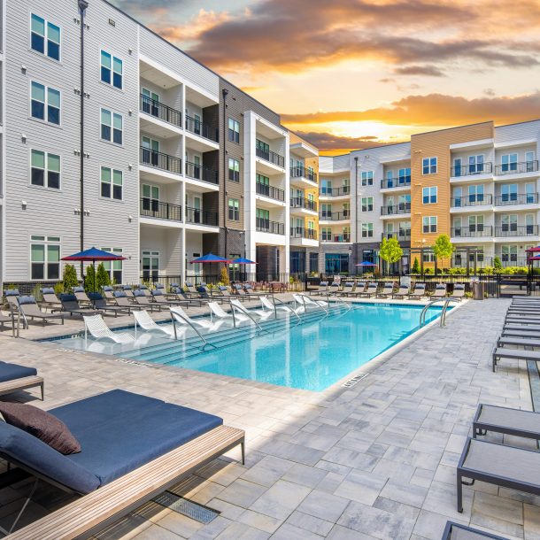 landscaped courtyard with a resort style pool, adjacent grilling stations, and