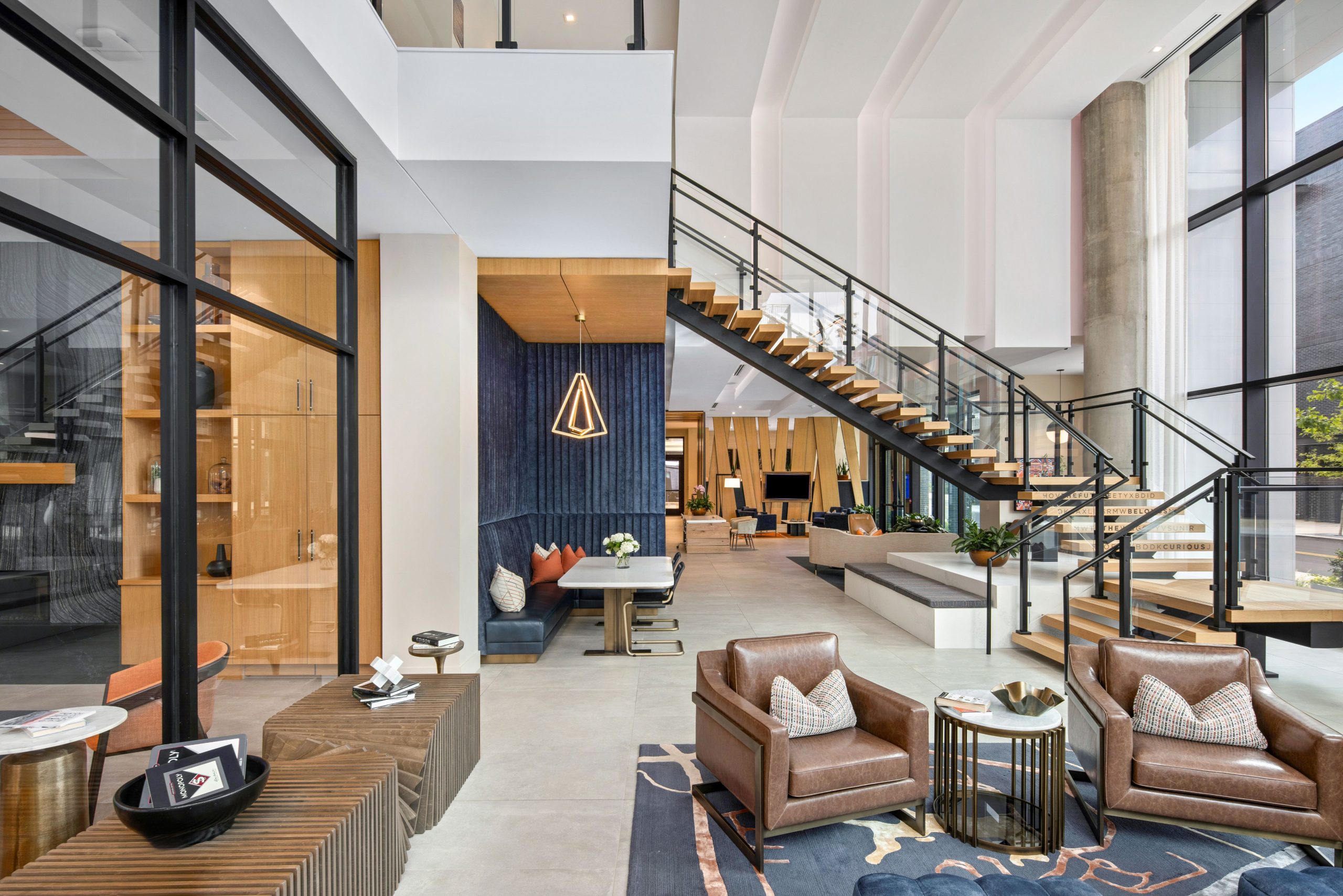 features a 2-story lobby area with a cyber