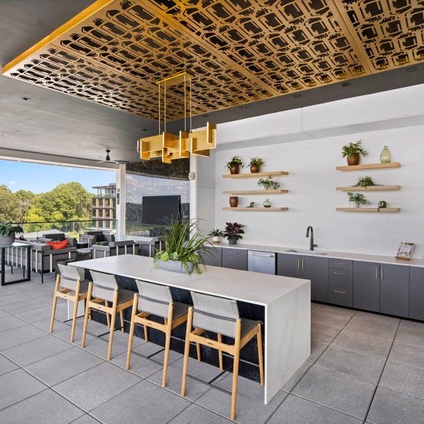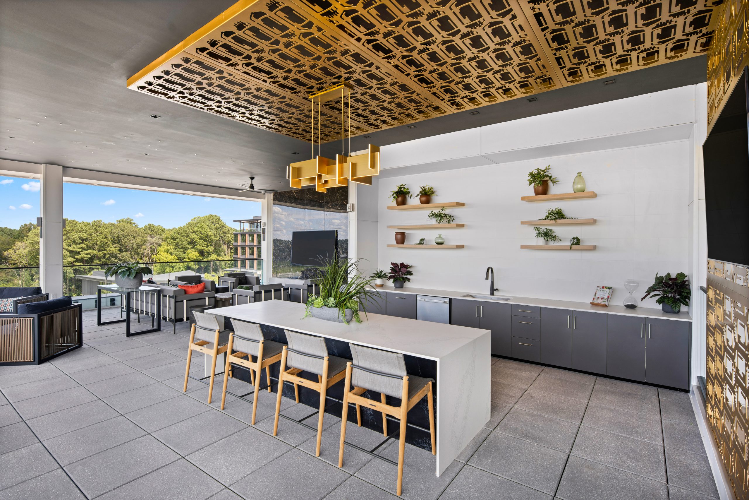 top-floor covered, open-air roof deck with