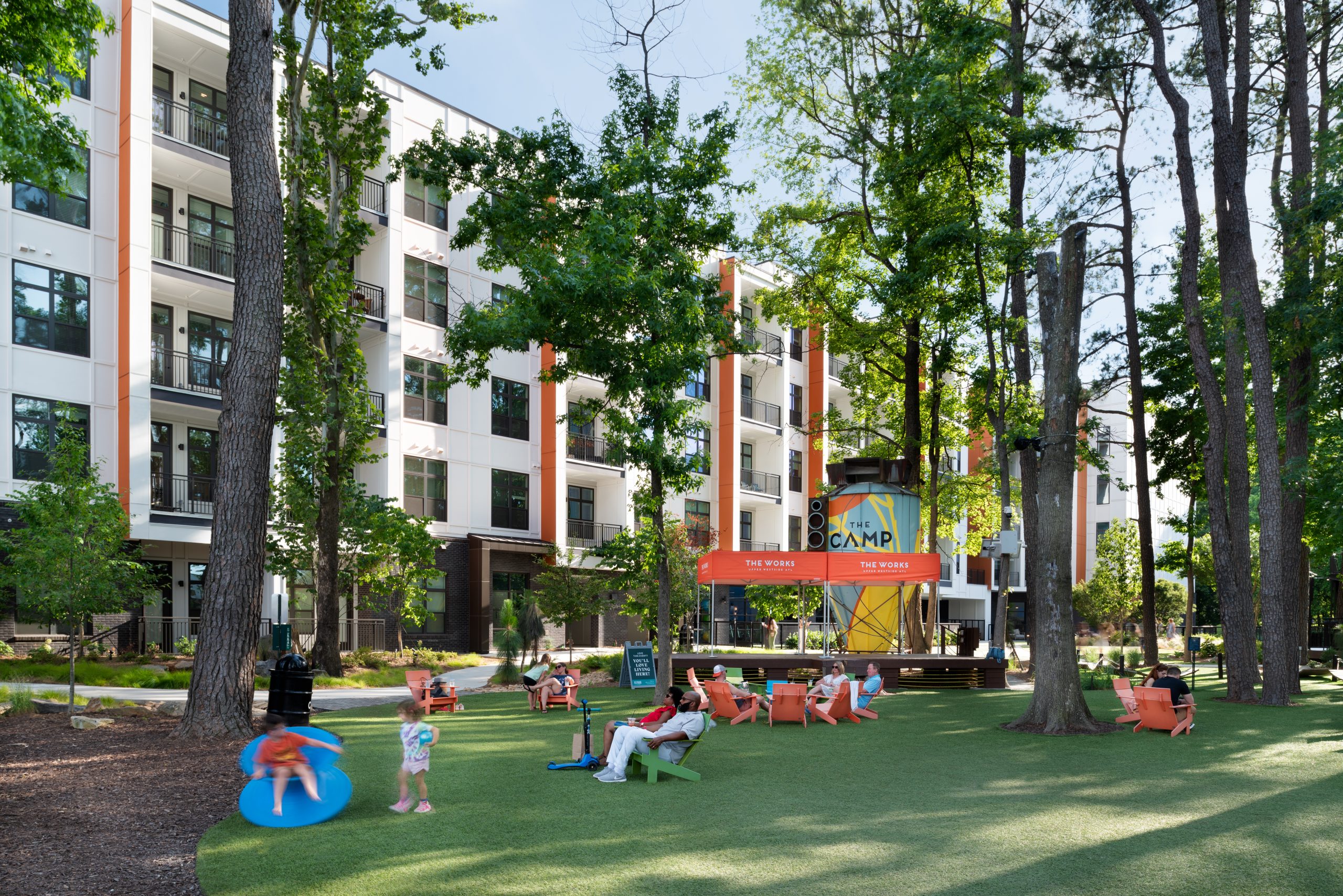 Westbound at The Works is a residential development on Chattahoochee Avenue in Atlanta, Georgia. This 6 story project consists of 306 multi-family apartment units with associated amenity spaces and a precast parking deck design to serve both residents and nearby retail. The North facing units line the existing “Camp” park that was previously developed as part of the overall Works development.