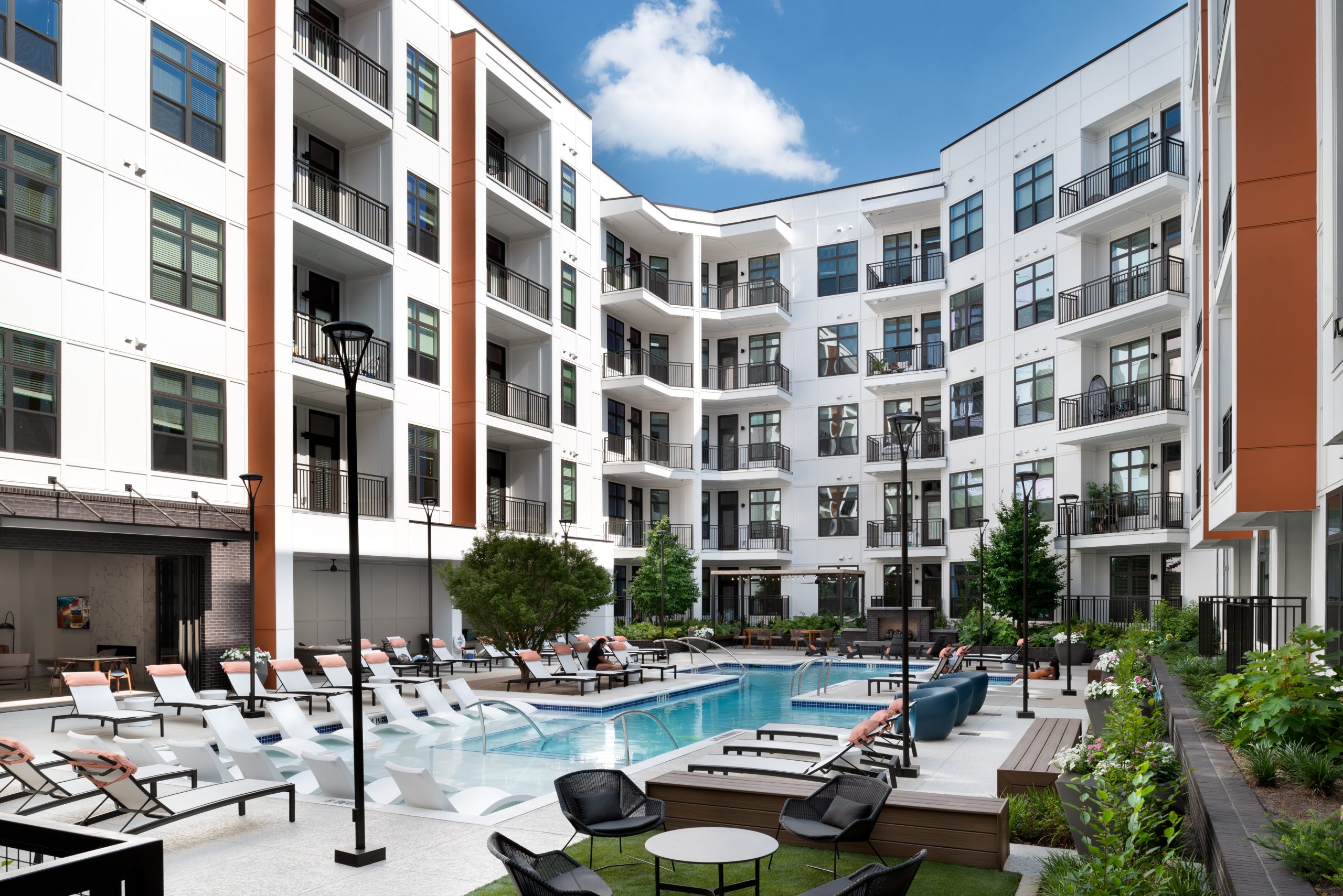 Amenities include a clubroom, sports bar, co-working space, fitness room, bike room, dog spa, dog park and resort style pool connected to a large covered breezeway. Apartments include a variety of 1- and 2- bedroom units with balconies.